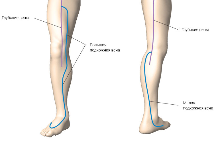 Подкожные вены представлены двумя основными стволами – большой и малой подкожными венами (Рисунок 2). У худых людей в вертикальном положении достаточно часто их можно увидеть невооруженным глазом. Большая подкожная вена идет от внутренней лодыжки вверх по внутренней поверхности голени и бедра и в области паховой складки впадает в глубокую венозную систему. Анатомия малой подкожной вены достаточно разнообразна, но в большинстве случаев она поднимается от наружной лодыжки по задней поверхности голени и впадает в глубокие вены в подколенной области.